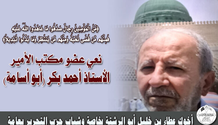 ينعى أمير حزب التحرير، وأعضاء مكتب الأمير، وديوان المظالم، والمكتب الإعلامي المركزي، وحزب التحرير بعامة… ينعون للأمة الإسلامية عضو مكتب الأمير الأستاذ أحمد بكر (أبو أسامة) الذي وافته المنية صباح هذا اليوم الثاني والعشرين من ربيع الأول 1447هـ الموافق الرابع عشر من أيلول/سبتمبر 2025م، عن عمر يناهز سبعةً وثمانين عاماً.